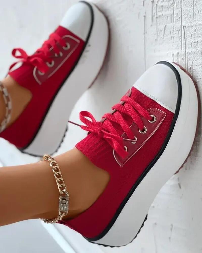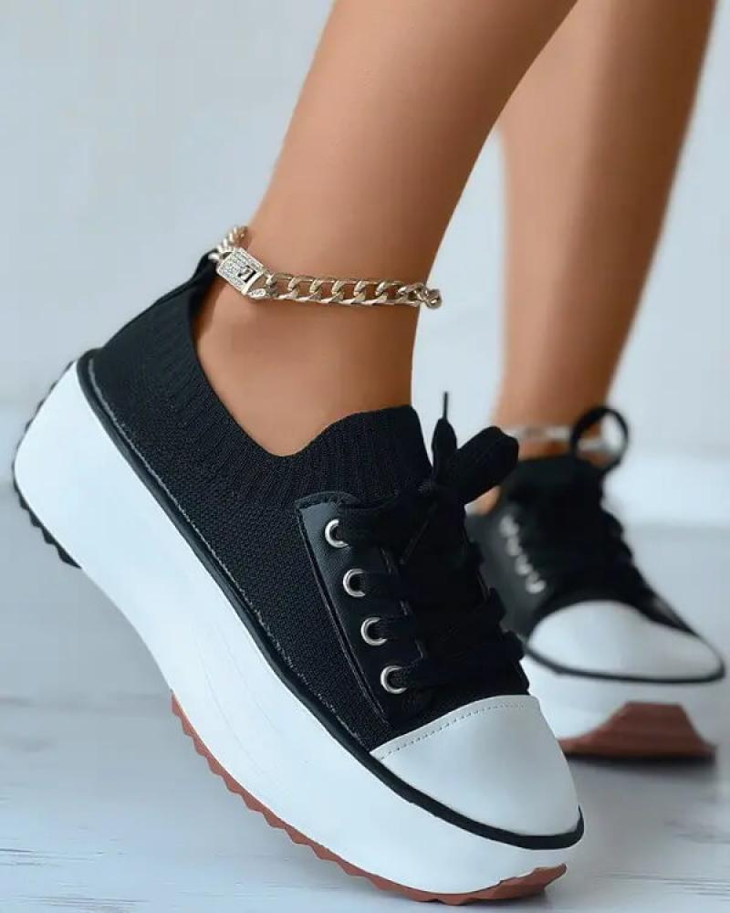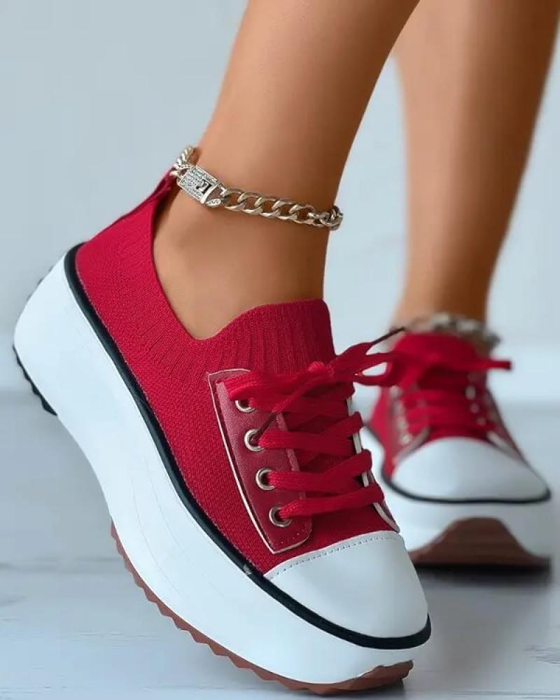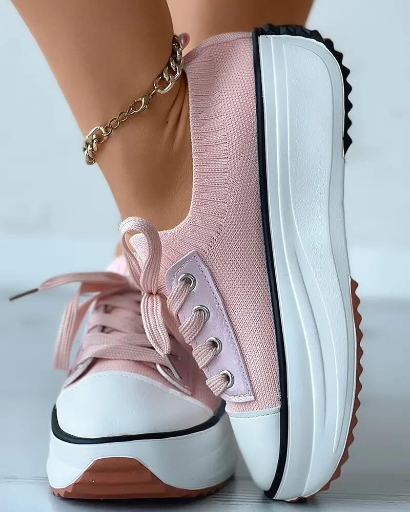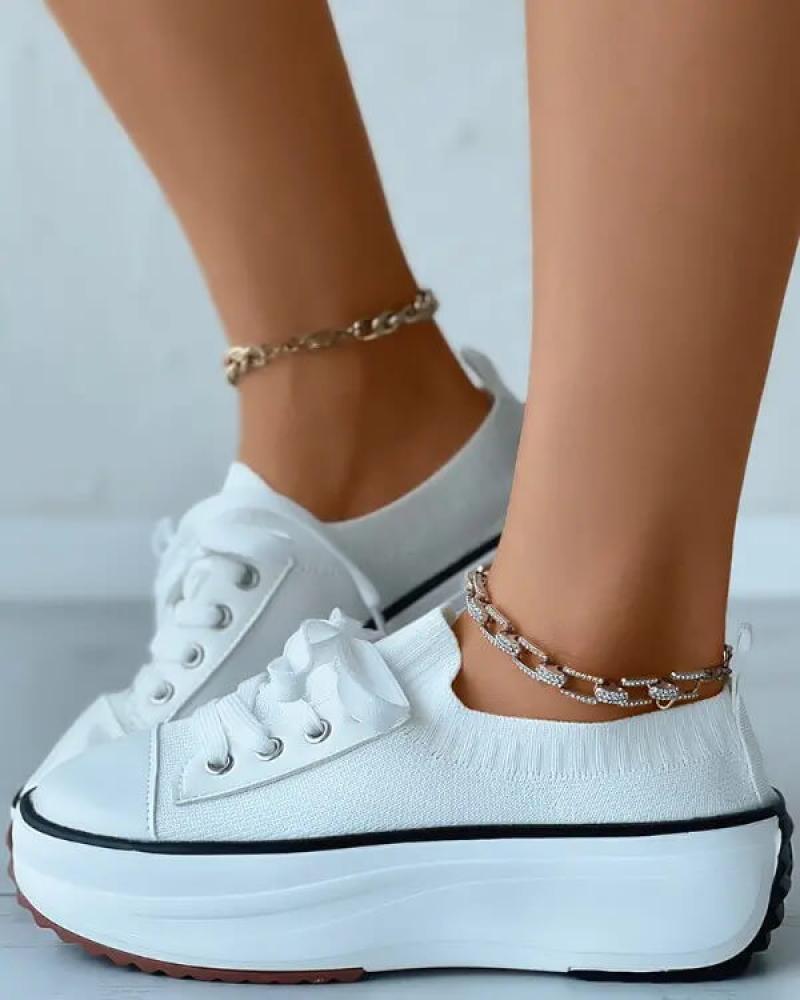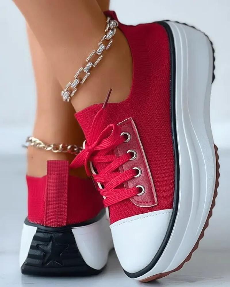 • Women's Fashion Outdoor Solid Color Round Toe Platform Lace-up Sneakers